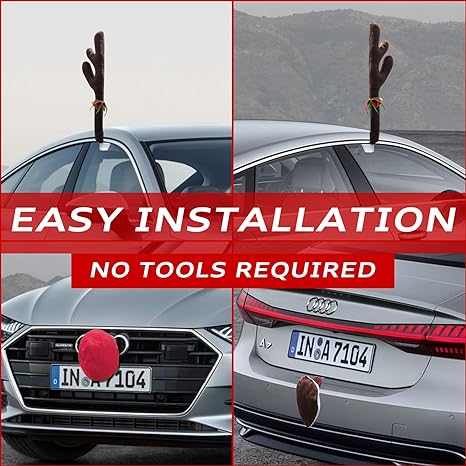 🎅HASSLE FREE INSTALLATION: Easy and simple installation process and does not require any tools or equipment. Simply roll your front or back windows down and clip the plastic hook onto the window and then roll the window back up to lock the antlers in place. To attach the reindeer nose, simply attach the strap to the grill of your vehicle. For the tail, you can tie it anywhere at the back of your car or clip the tie in the trunk of your car.